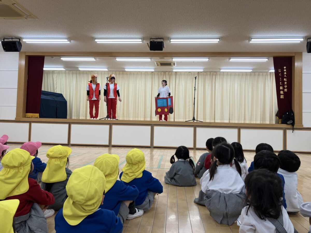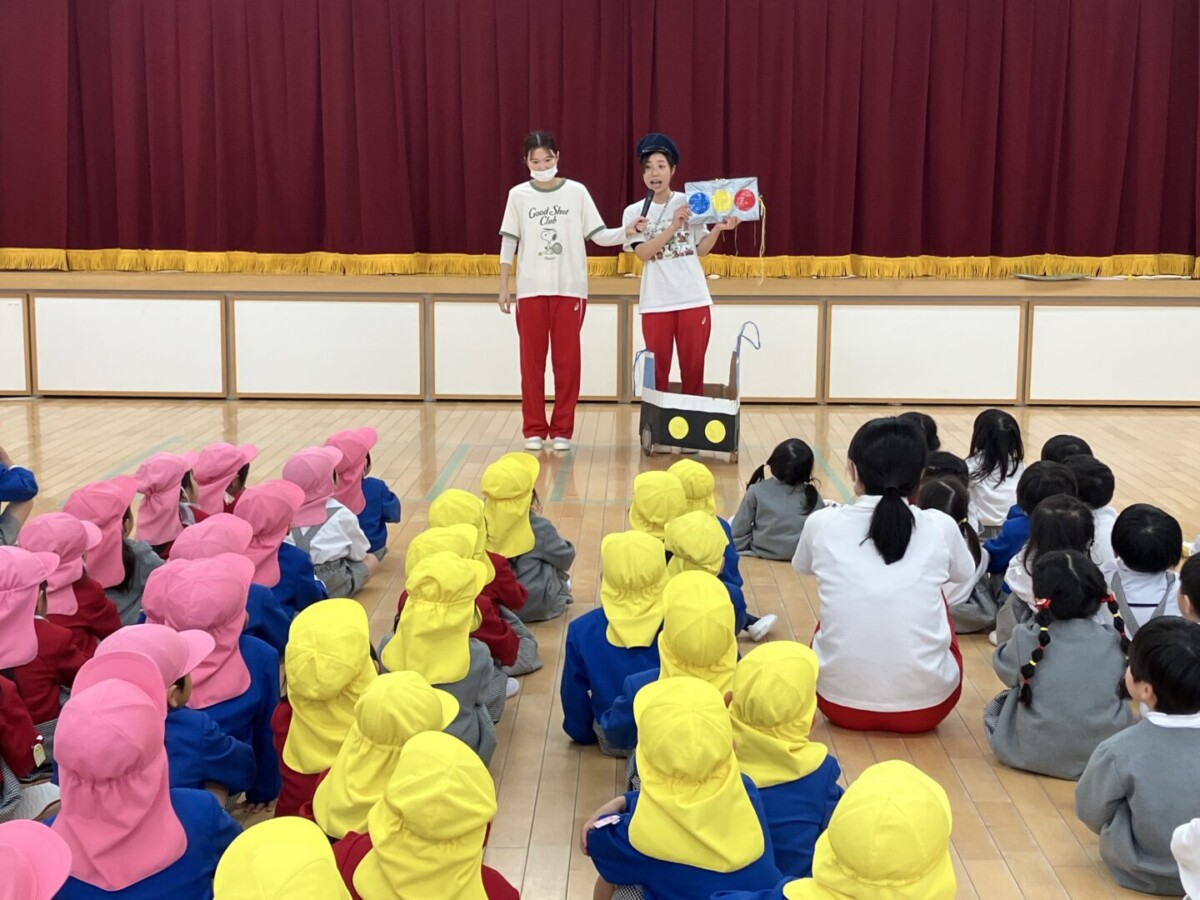 先生達の劇では、「道路に飛び出たボールを追いかけない・横断歩道のないところで急に道路に飛び出さない・停まっている車の後ろや駐車場では遊ばない」3つの約束を教えてもらいました。