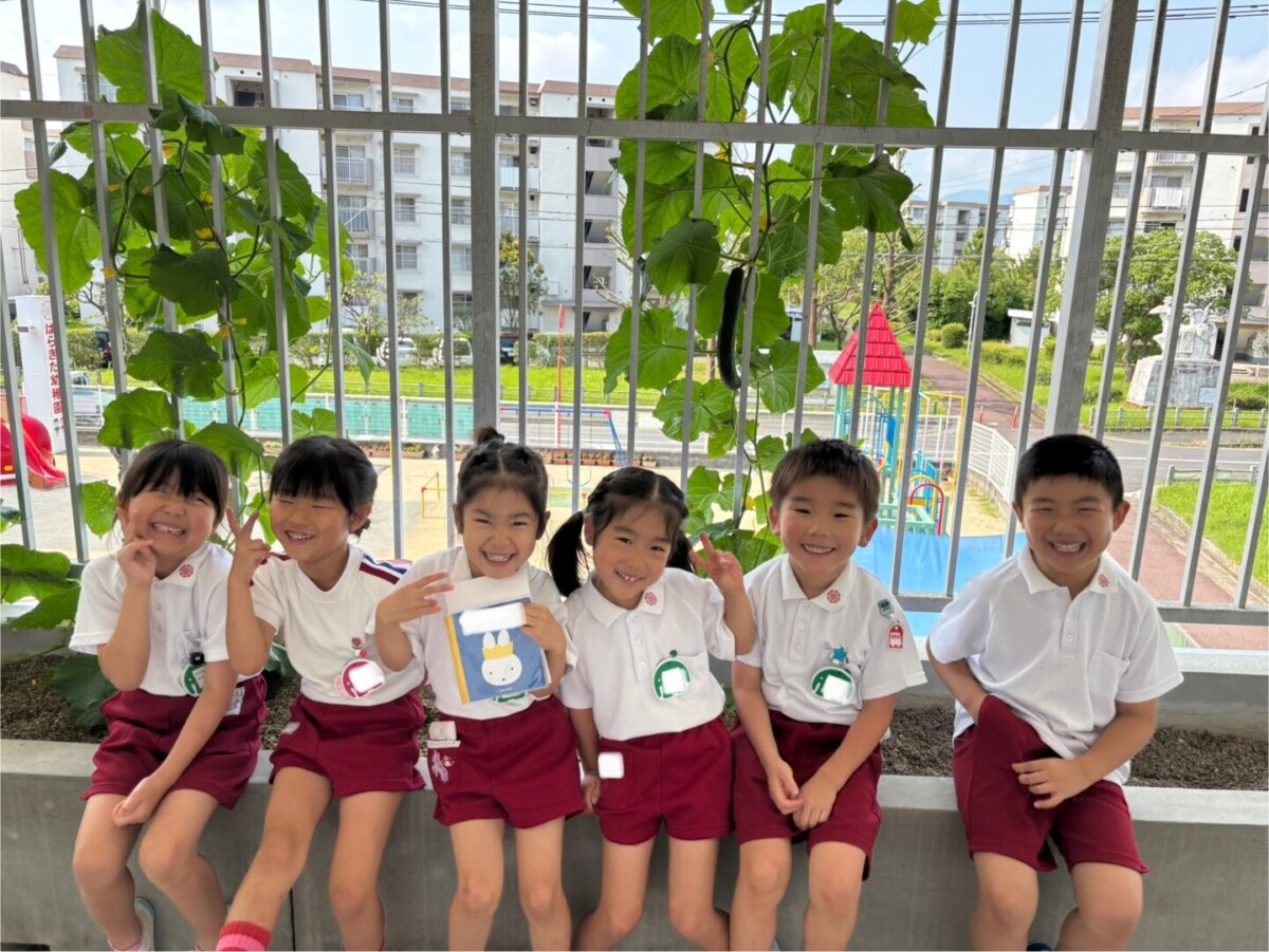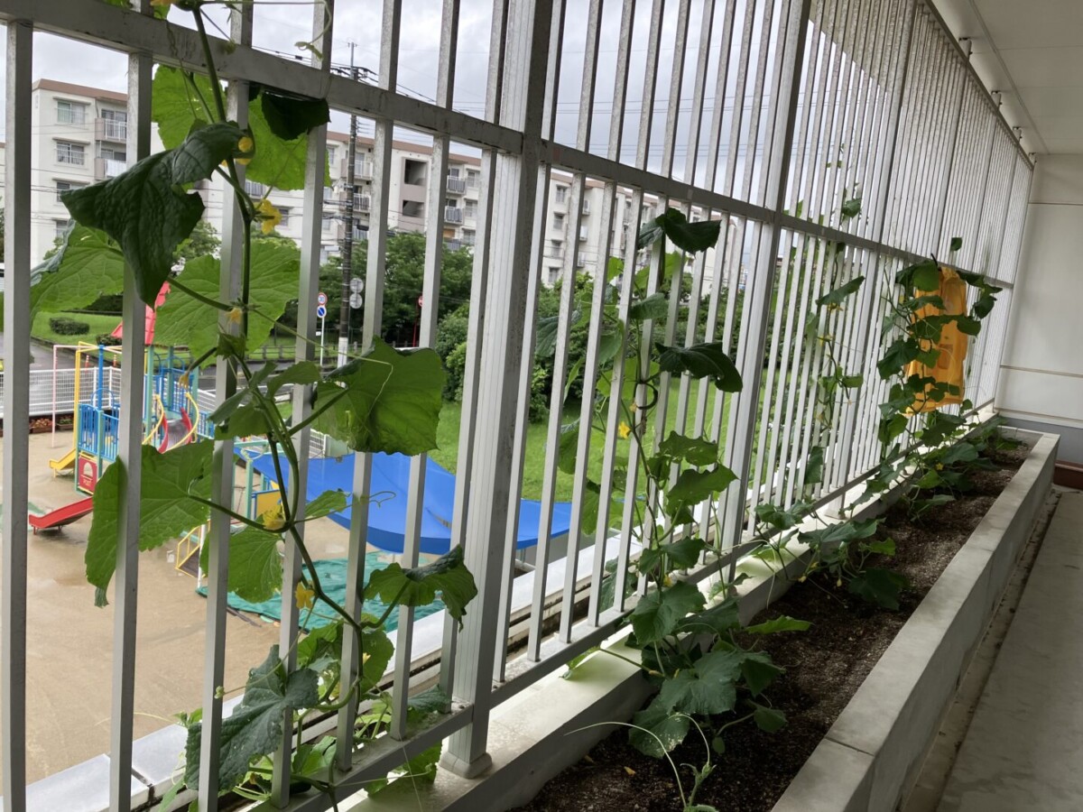 年長組さんが6月上旬に植えたきゅうりの苗。毎日みんなでお水をあげて、ぐんぐんツルが伸びました。