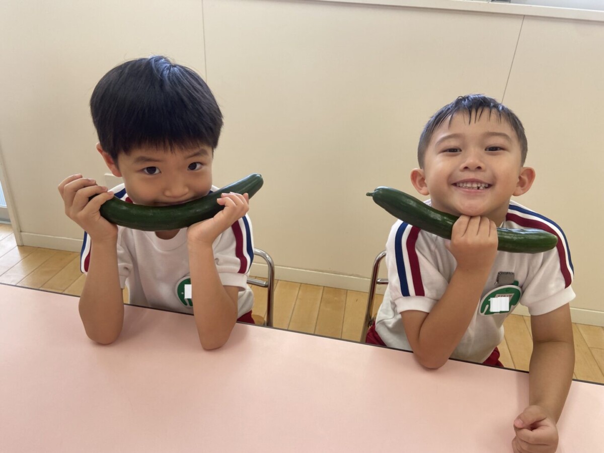 年長組さんだけですが、収穫したきゅうりはさっそく「塩もみきゅうり」にしてお給食の時間に食べました。