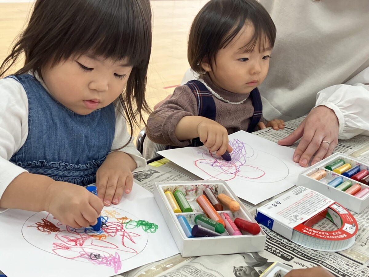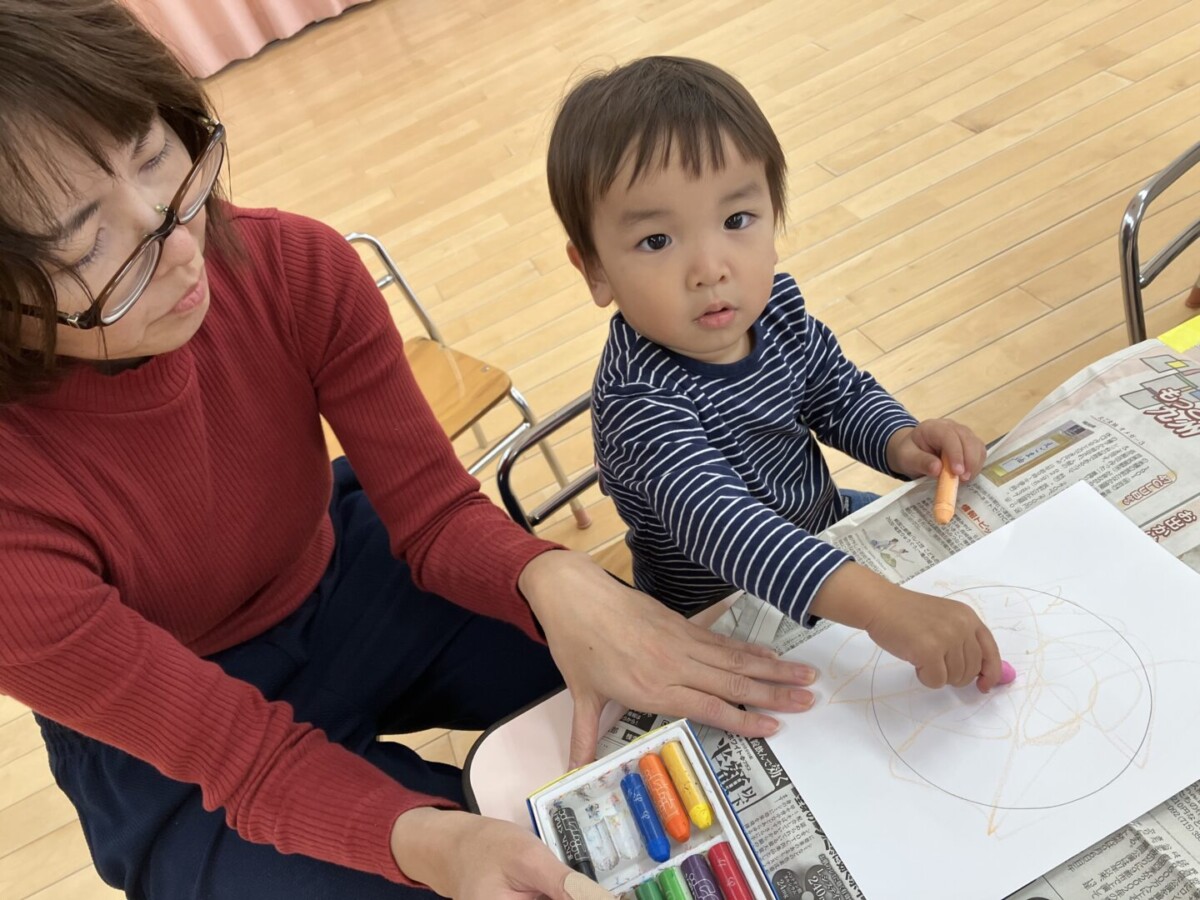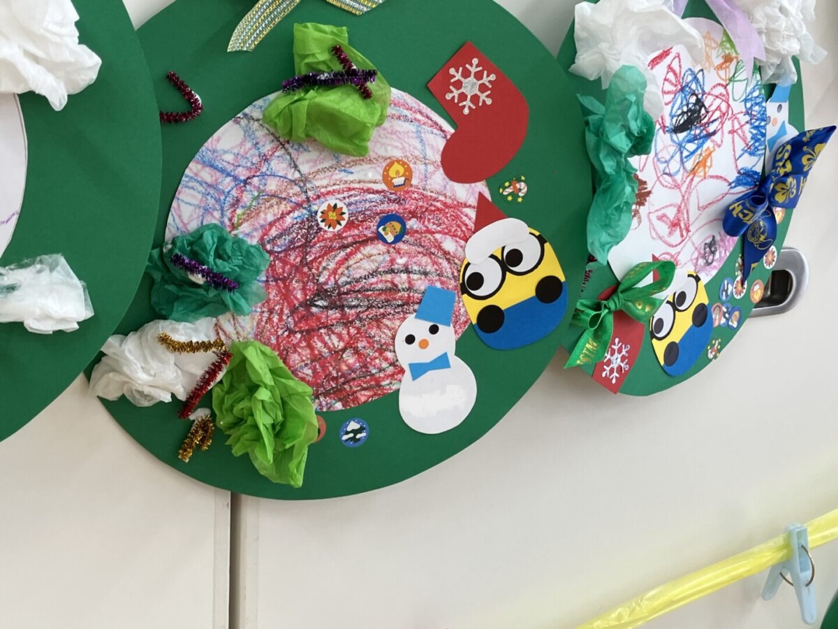 今回は「クレパスあそび」。ちょっびり気が早いですが、クリスマスに向けてリースを作りました♪
