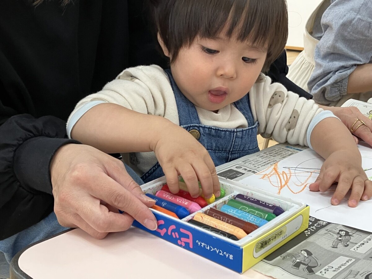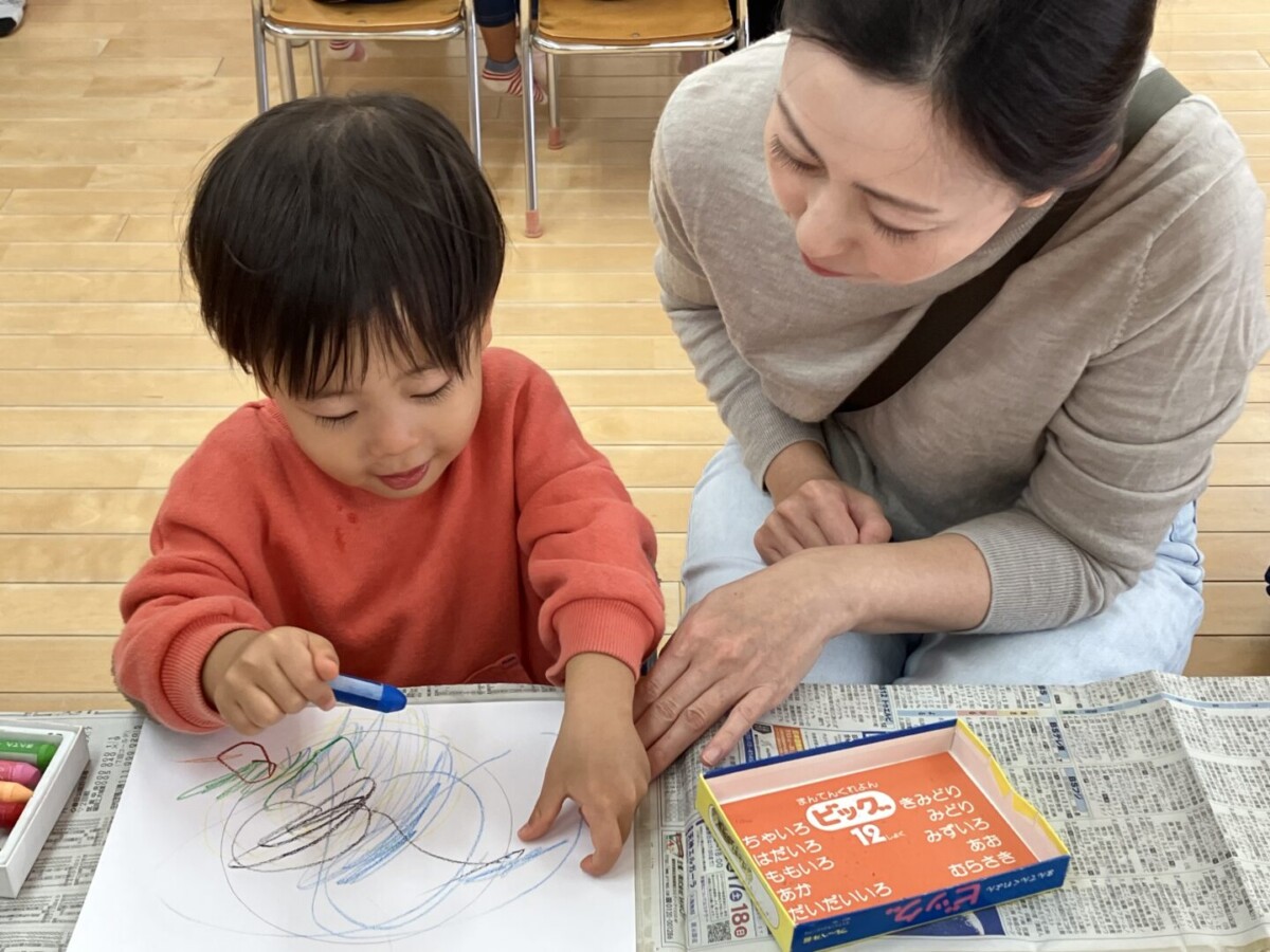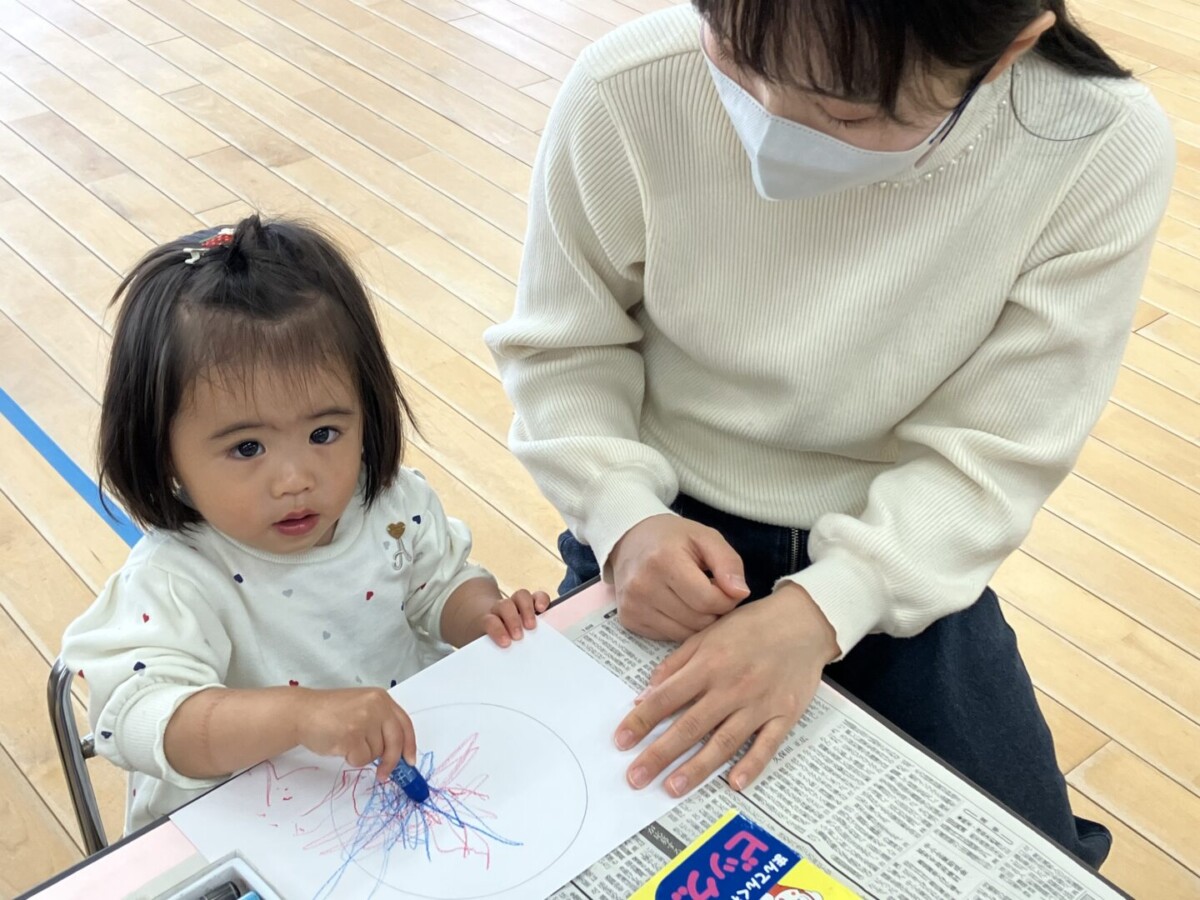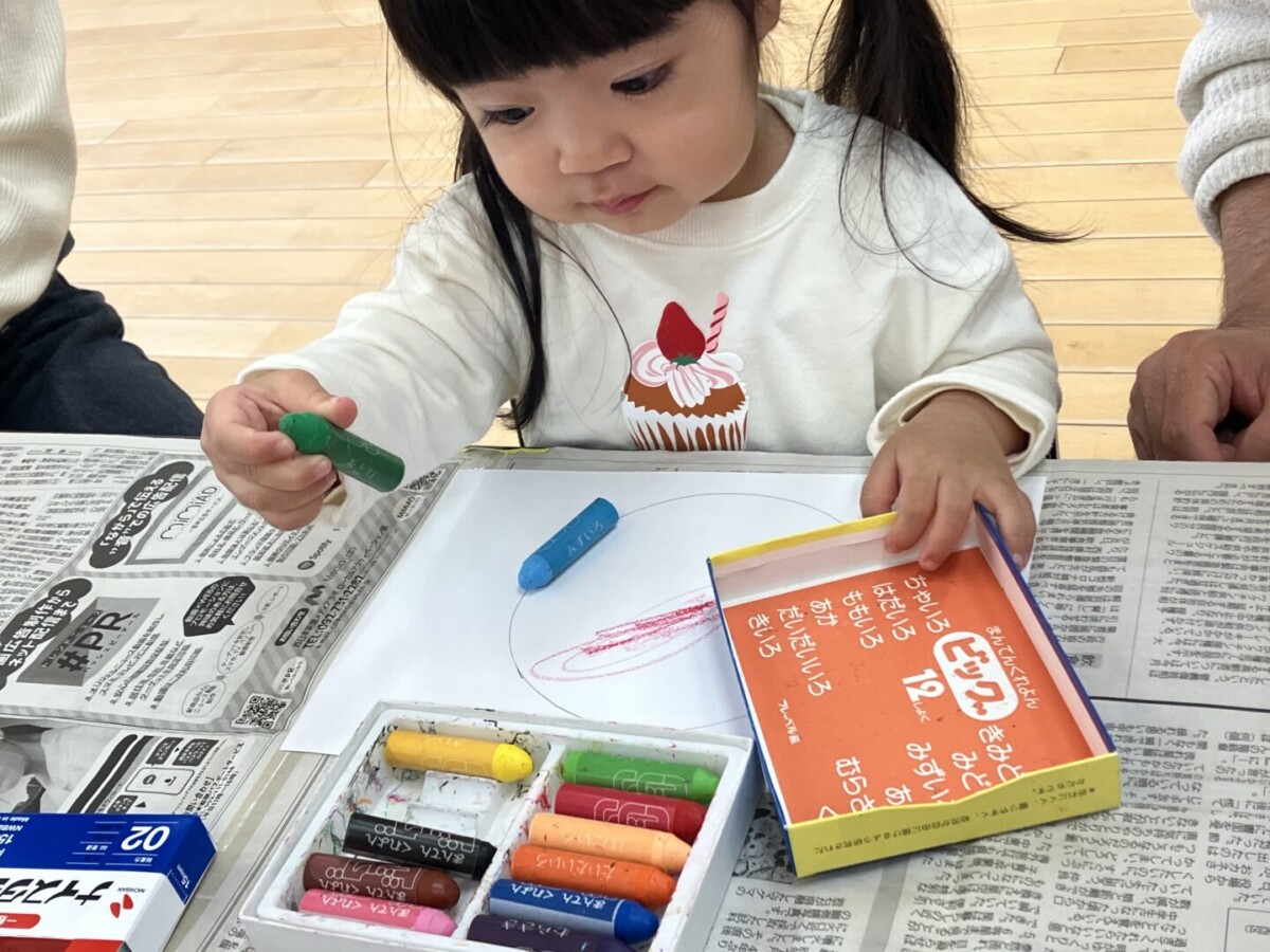 今回は「クレパスあそび」。ちょっびり気が早いですが、クリスマスに向けてリースを作りました♪