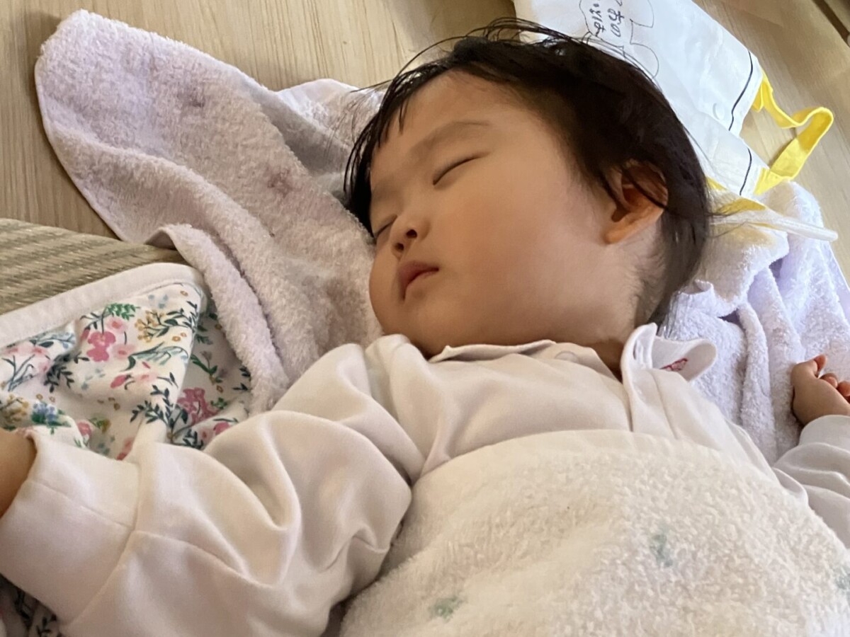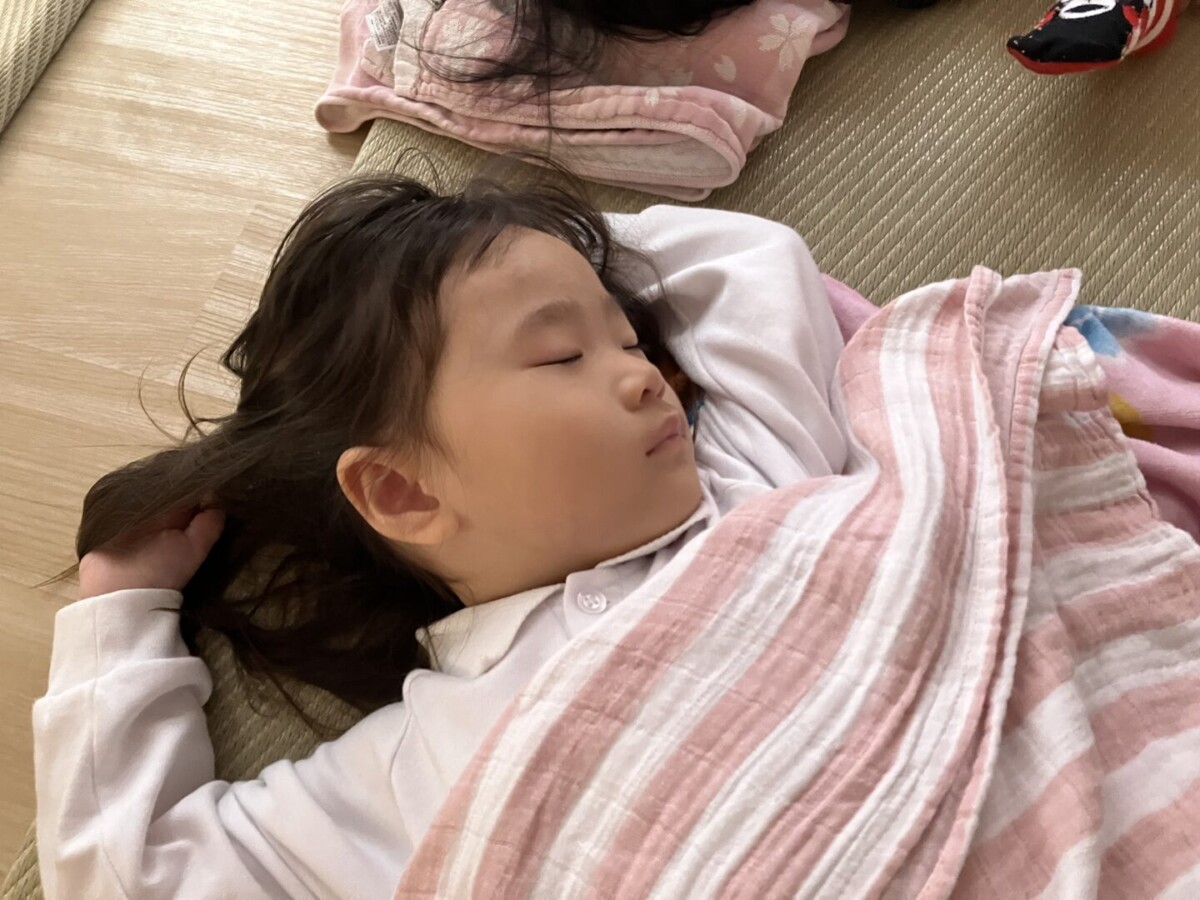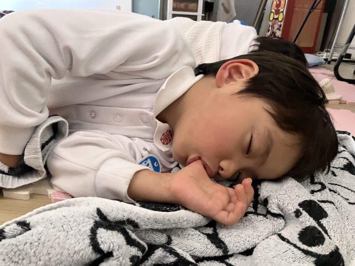 パネル畳を敷いて、お家から持ってきているお気に入りのタオルでお昼寝です。