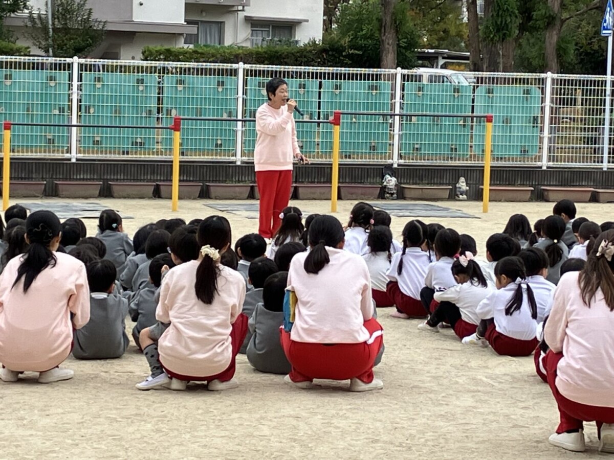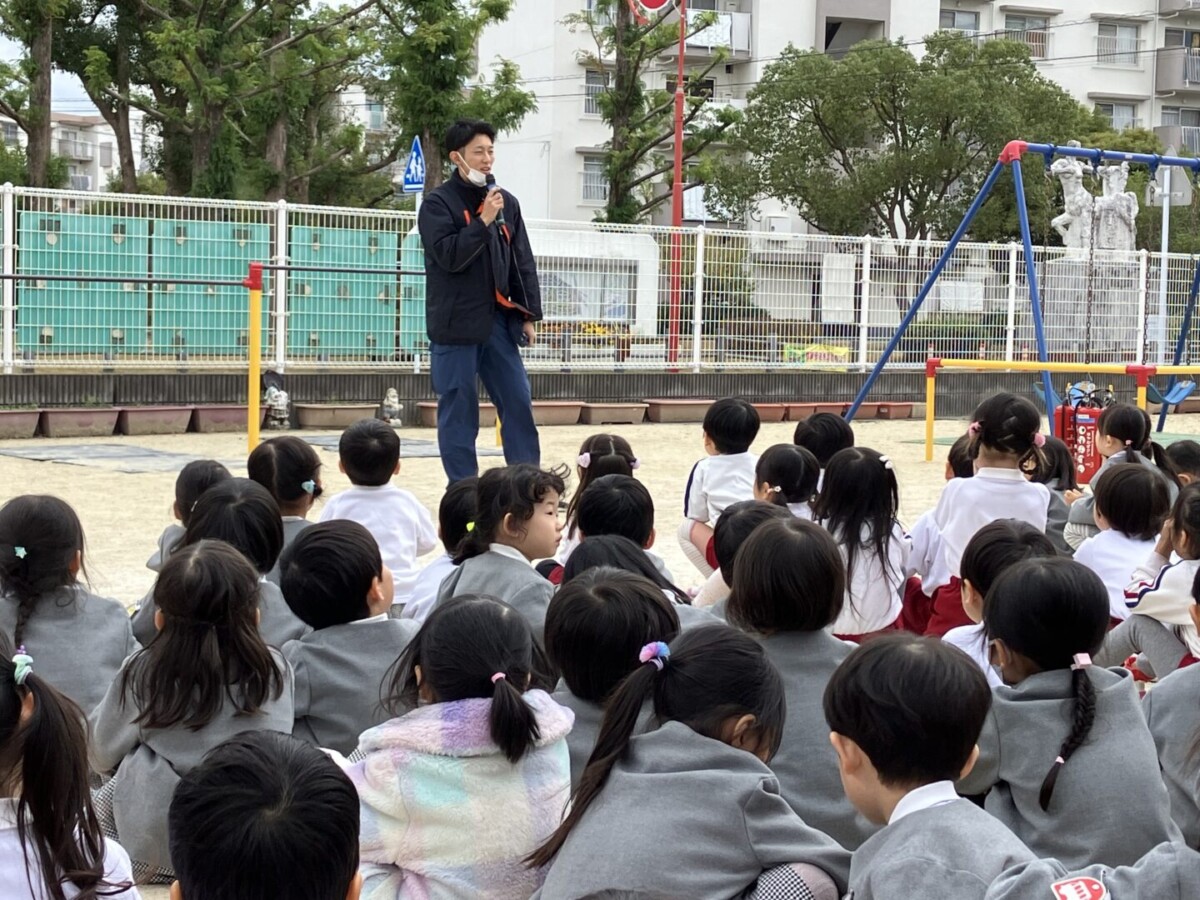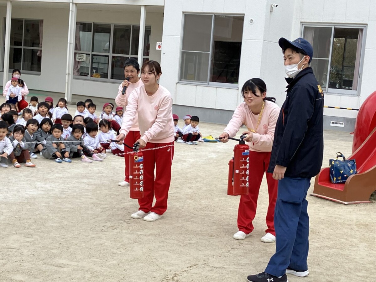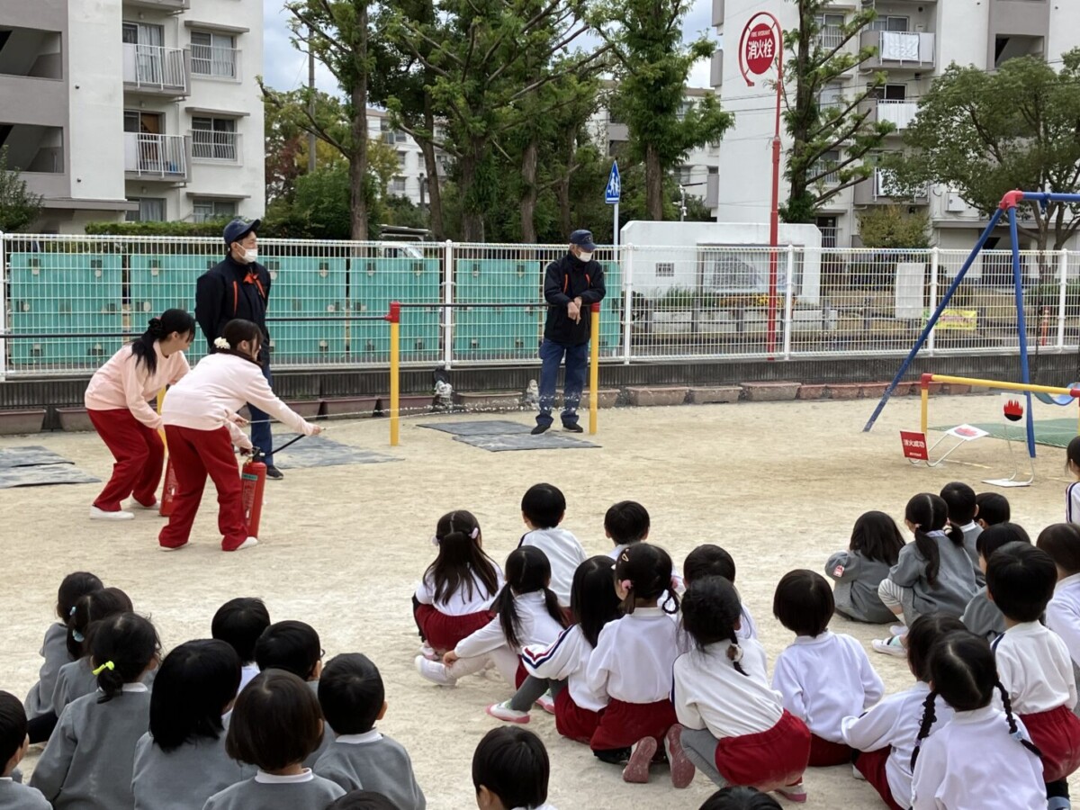2025.11.24はらきた幼稚園日記 11月☆避難訓練☆午後の時間に避難訓練をしました。今回は、火災訓練。非常ベルと事務室からの放送を聞いて、先生と一緒に園庭まで避難しました。訓練のお約束「お・は・し・も・よ」のお話も聞いて、しっかり確認できました☆早良消防署の方にもお話もしていただき、消火器の使い方も教えていただきました。